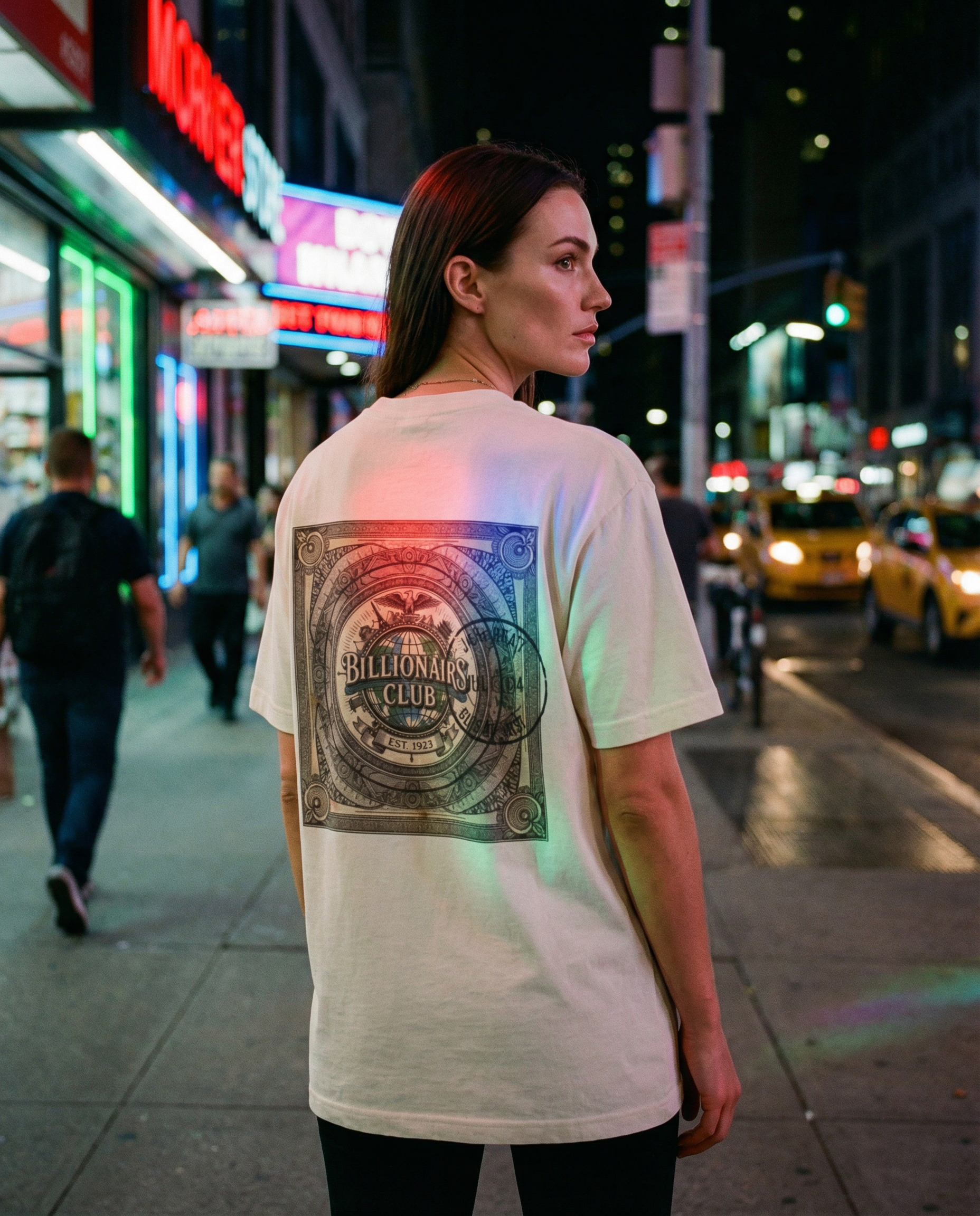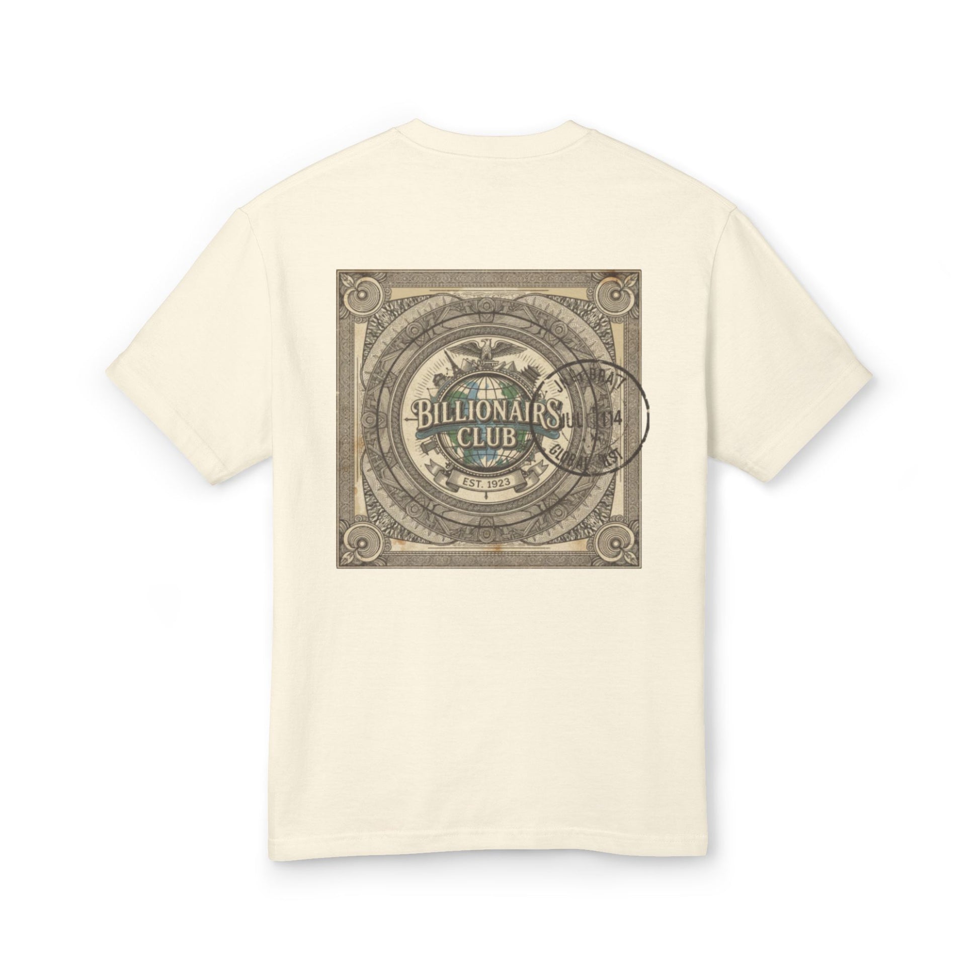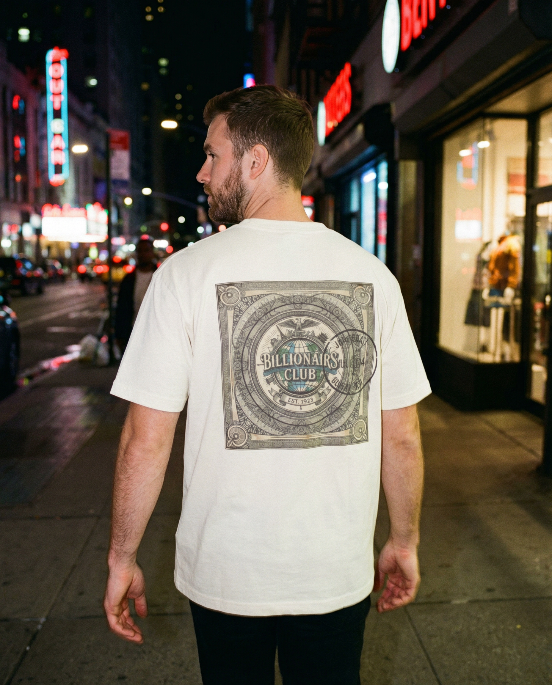 An understated essential crafted from premium heavyweight cotton, tailored for a clientele that values depth over noise and heritage over hype. The Billionairs Club edition embodies the aesthetic of legacy wealth and cultivated discretion — conveyed through a refined destination-stamp composition on the back, influenced by private-member insignia, understated crest forms, and the quiet rituals of old-world affluence.
