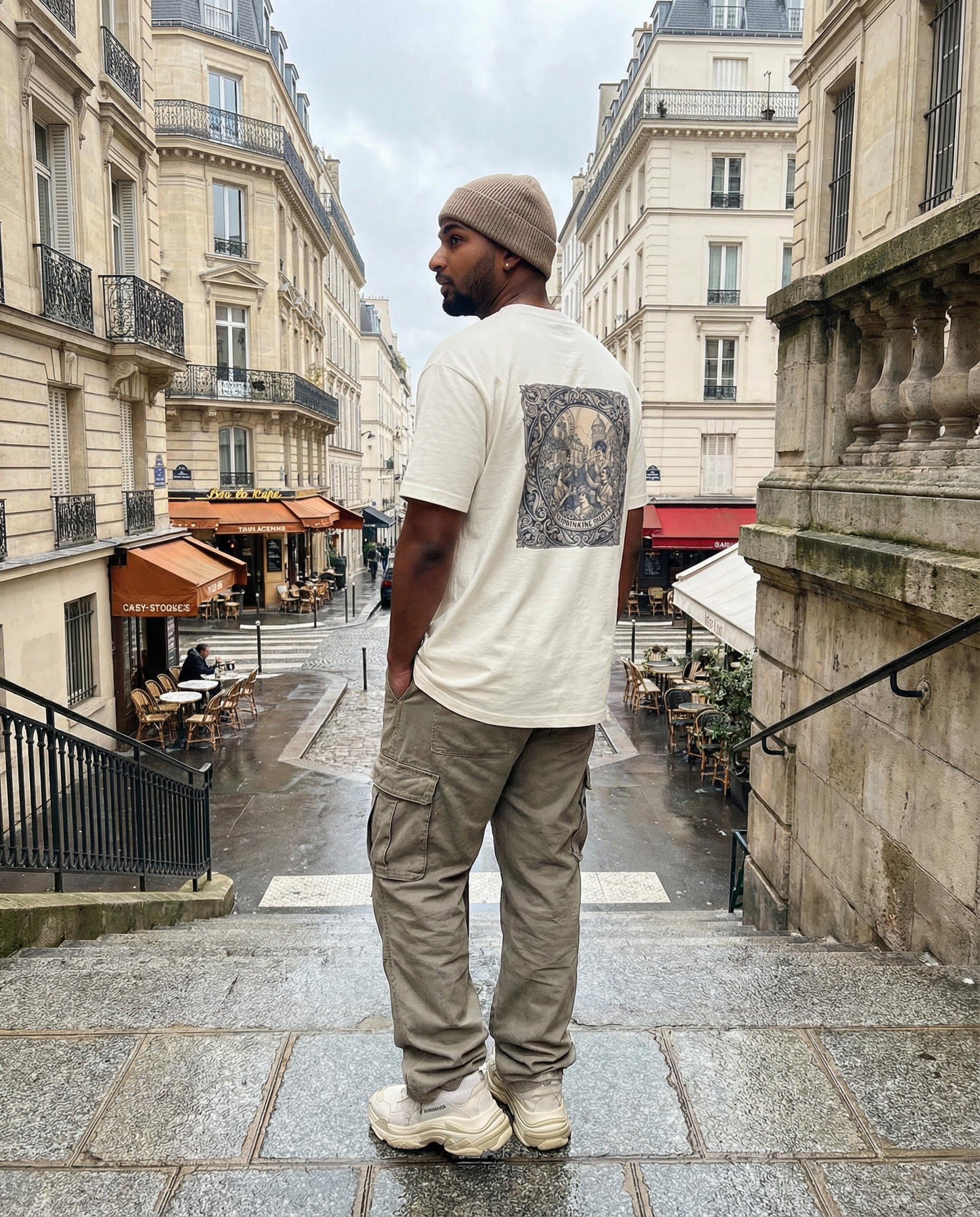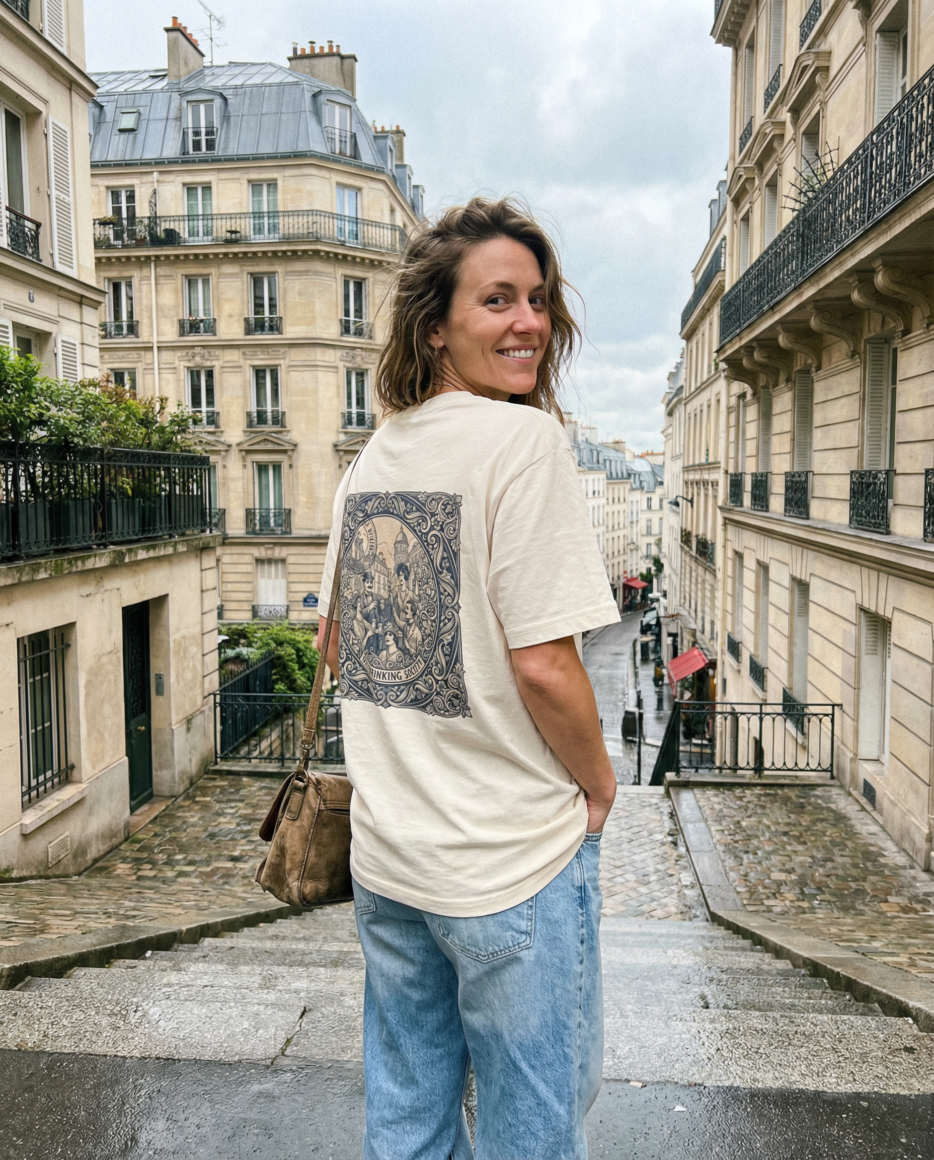 This heavyweight cotton tee feels like a found favorite from day one. The garment-dyed fabric gives the natural cream base a lived-in depth, while the detailed, vintage-inspired circular illustration on the back and matching chest emblem bring an old-map, coastal-explorer mood. It hangs with a relaxed fit and a wide rib collar for a laid-back silhouette, and the heavy 6.0 oz cotton holds the print beautifully so the artwork stays bold wash after wash. Ethically made and OEKO-TEX certified, it’s for people who care about craft, provenance, and clothing that tells a story — worn on slow mornings, coastal drives, and nights around a campfire where conversation drifts to routes not yet taken.