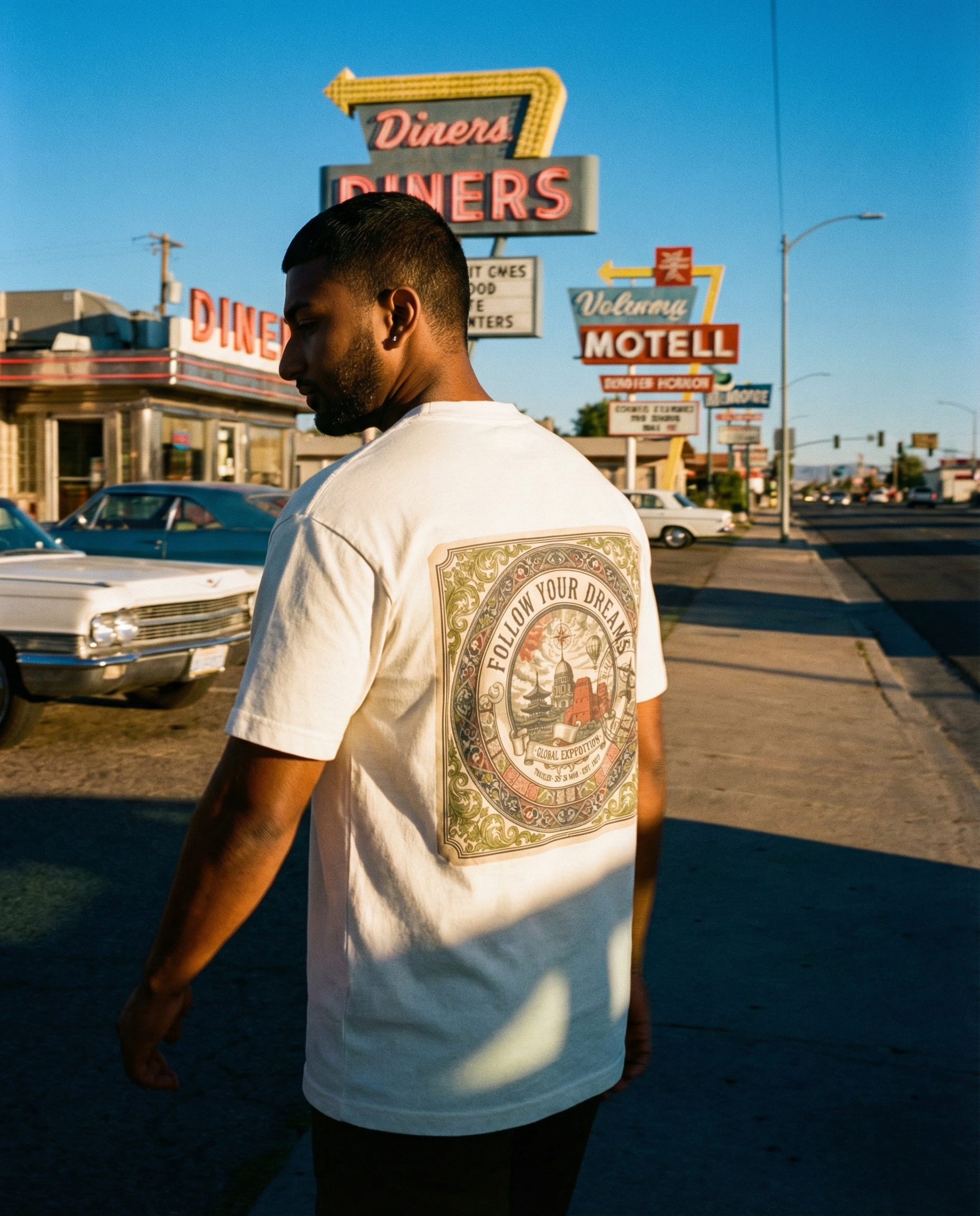 An understated essential crafted from premium heavyweight cotton, tailored for a clientele that values depth over noise and heritage over hype. The Follow Your Dreams edition carries a quiet motivational resonance — expressed through a refined stamp-style composition on the back, inspired by journey marks, aspirational typography, and the enduring pursuit of personal vision and direction.