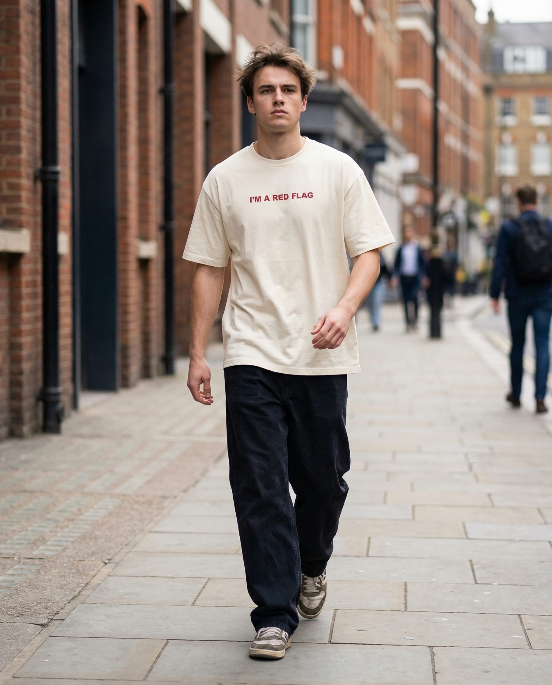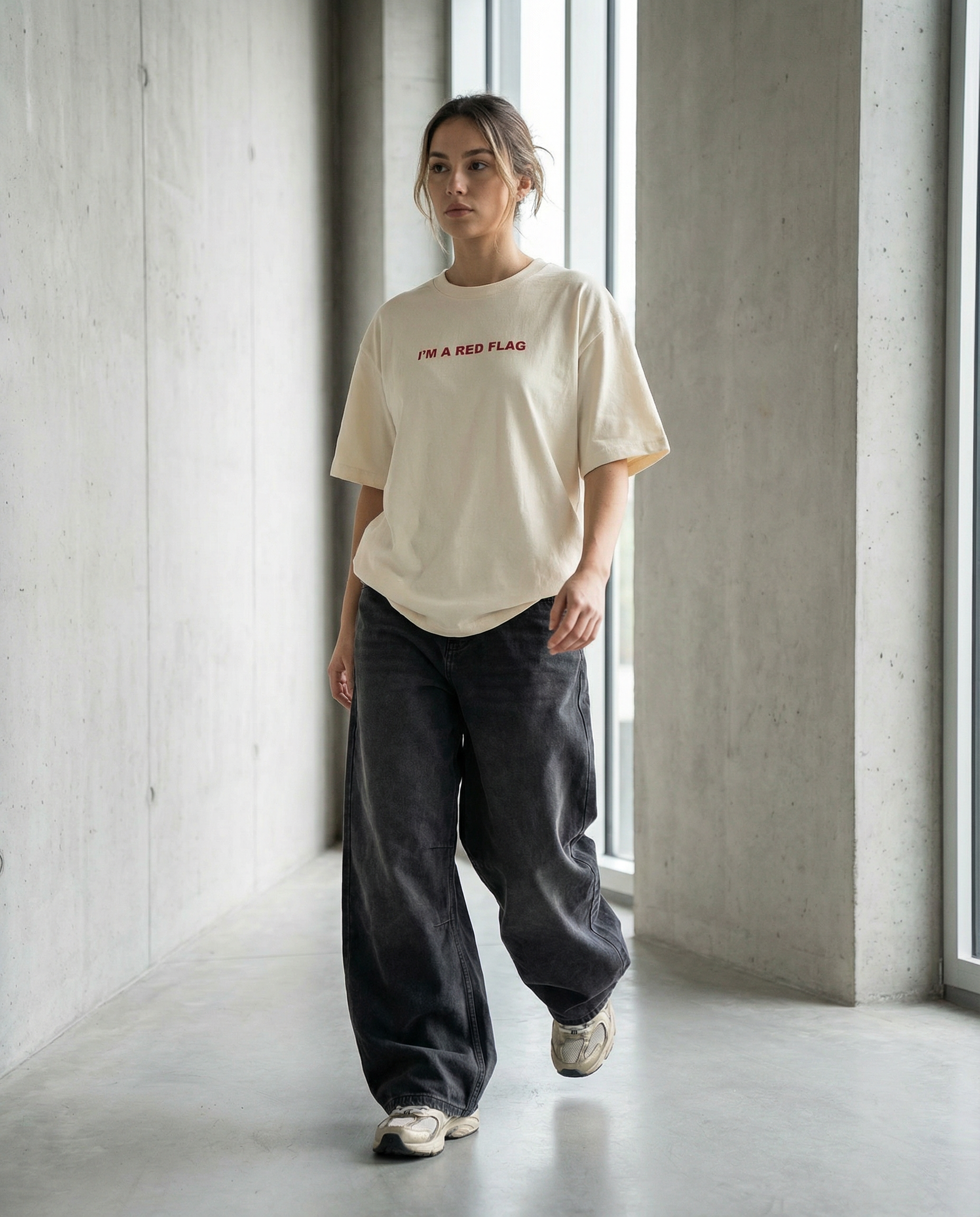 An understated essential crafted from premium heavyweight cotton — except this one carries a wink of self-awareness and a spark of playful chaos. The “I’M A RED FLAG” edition turns confession into fashion, rendered through a tongue-in-cheek stamp-style graphic on the back that echoes comedic warning labels, social-signal aesthetics, and the kind of honesty that arrives with both irony and charm.