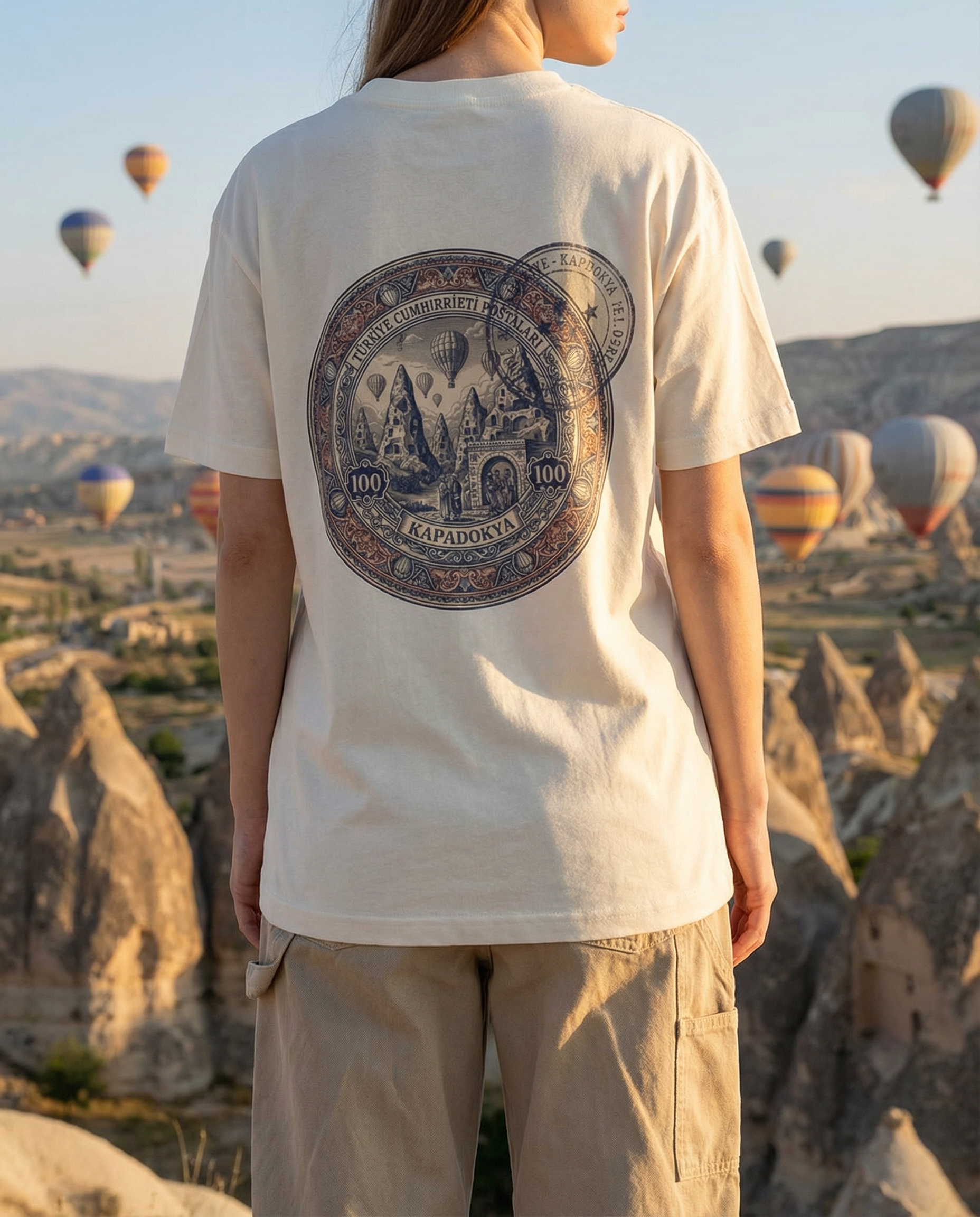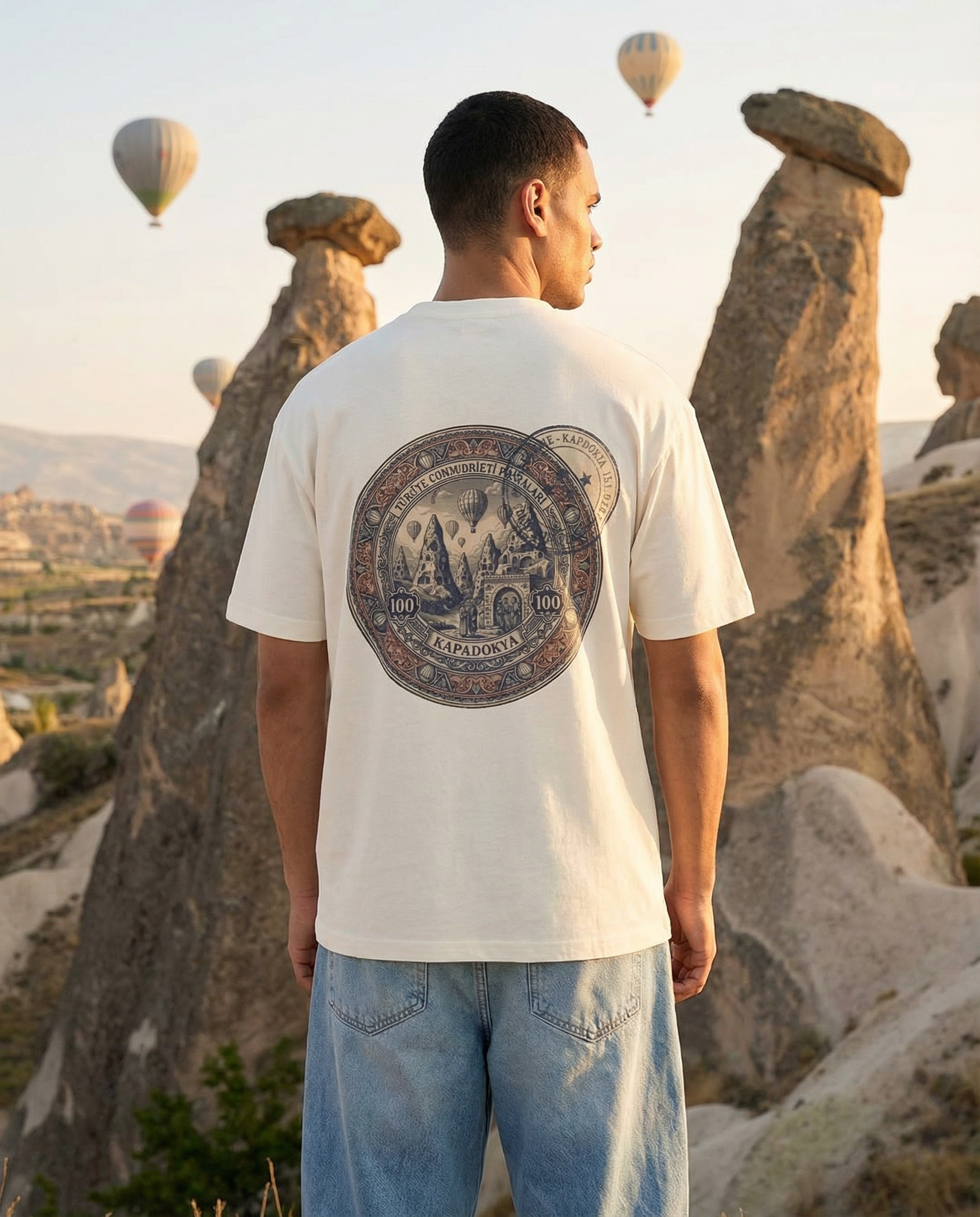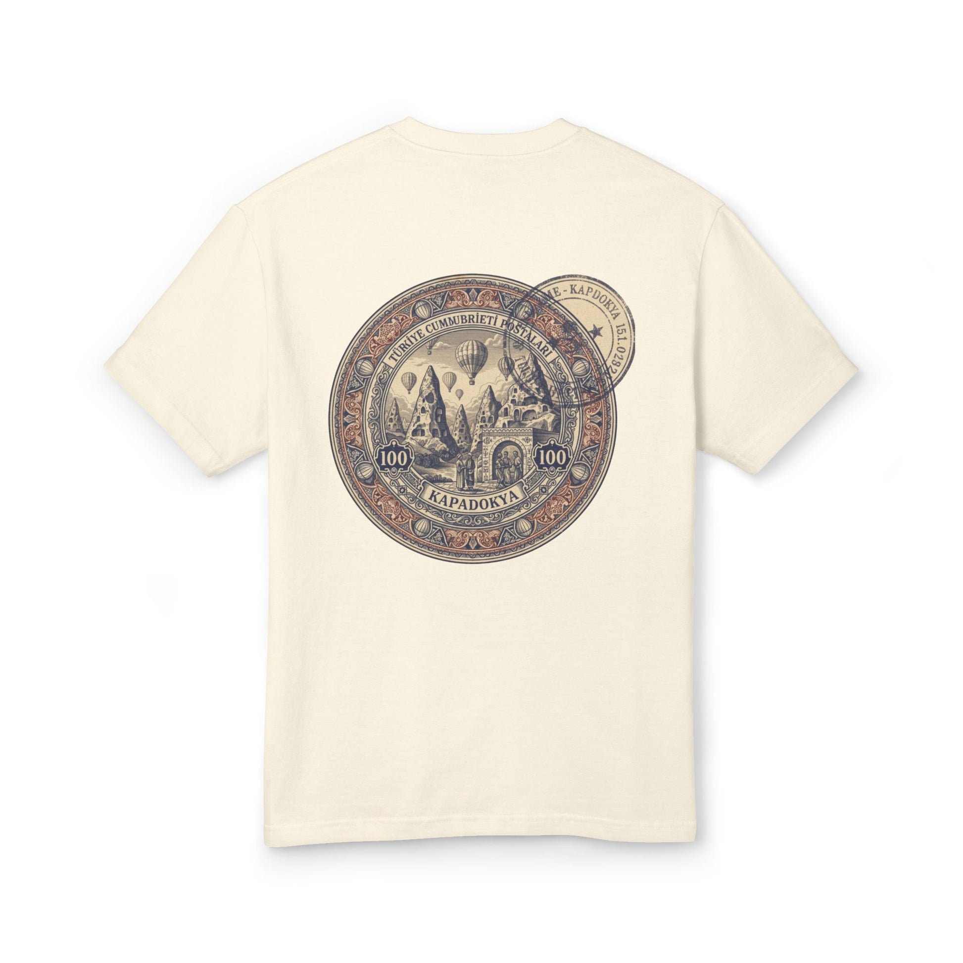 An understated essential crafted from premium heavyweight cotton, tailored for a clientele that values depth over noise and heritage over hype. The Kapadokia edition captures the dreamlike surrealism of Turkey’s ancient landscape — rendered through a refined destination-stamp composition on the back, inspired by carved stone dwellings, wind-shaped rock formations, and the mythic quiet of dawn skies filled with drifting balloons.
